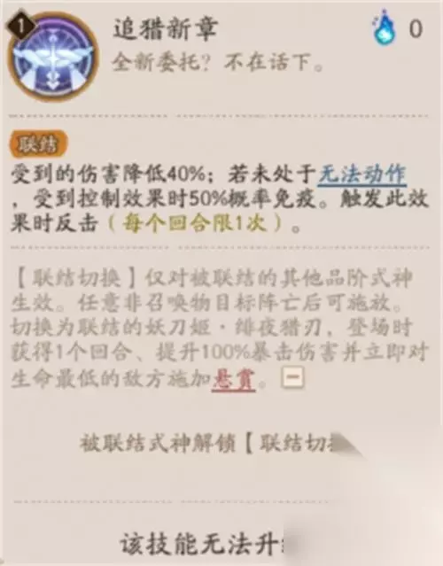 追猎新章 联结 受到的伤害降低40%;若未处于无法动作,受到控制效果时50%概率免疫。触发此效果时反击(每个回合限1次)。 【联结切换】仅对被联结的其他品阶式神生效。任意非召唤物目标阵亡后可施放。切换为联结的妖刀姬·绯夜猎刃,登场时获得1个回合、提升100%暴击伤害并立即对生命最低的敌方施加悬赏。 被联结式神解锁【联结切换】 该技能无法升级 悬赏 【通用,印记】敌方场上至多存在1个,存在时妖刀姬·绯夜猎刃攻击忽视50%防御。携带者回合结束后,妖刀姬·绯夜猎刃提升30%行动条(妖刀姬·绯夜猎刃每个回合开始前限1次)。 无法动作 受到放逐和控制效果中的冰冻、沉睡、眩晕、变形、深度冰冻、影缚、霜冻、拘魂和沉沦时,皆视为无法动作。