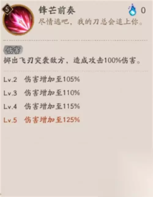 式神技能 锋芒前奏 伤害 掷出飞刃突袭敌方,造成攻击100%伤害。 Lv.2 伤害增加至105% Lv.3 伤害增加至110% Lv.4 伤害增加至115% Lv.5 伤害增加至125%