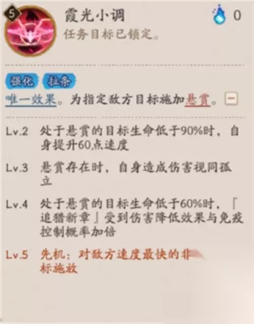 霞光小调 0火 强化 拉条 唯一效果。为指定敌方目标施加悬赏。 Lv.2 处于悬赏的目标生命低于90%时,自身提升60点速度 Lv.3 悬赏存在时,自身造成伤害视同孤 Lv.4 处于悬赏的目标生命低于60%时,「追猎新章」受到伤害降低效果与免疫控制概率加倍 Lv.5 先机:对敌方速度最快的非召唤物目标施放 悬赏 【通用,印记】敌方场上至多存在1个,存在时妖刀姬·绯夜猎刃攻击忽视50%防御。携带者回合结束后,妖刀姬·绯夜猎刃提升30%行动条(妖刀姬·绯夜猎刃每个回合开始前限1次)。 孤立 最多只有1个敌方目标被孤立。自身无法被其他友方选中。受到的伤害无法被其他效果所分担、代替承受,例如式神白藏主「梦山狐影」、椒图「涓流」、御魂「薙魂」等。 唯一效果 若是有多个同名式神在场,只有其中一个式神的此技能会生效。 先机 在战斗开始时进行动作。
