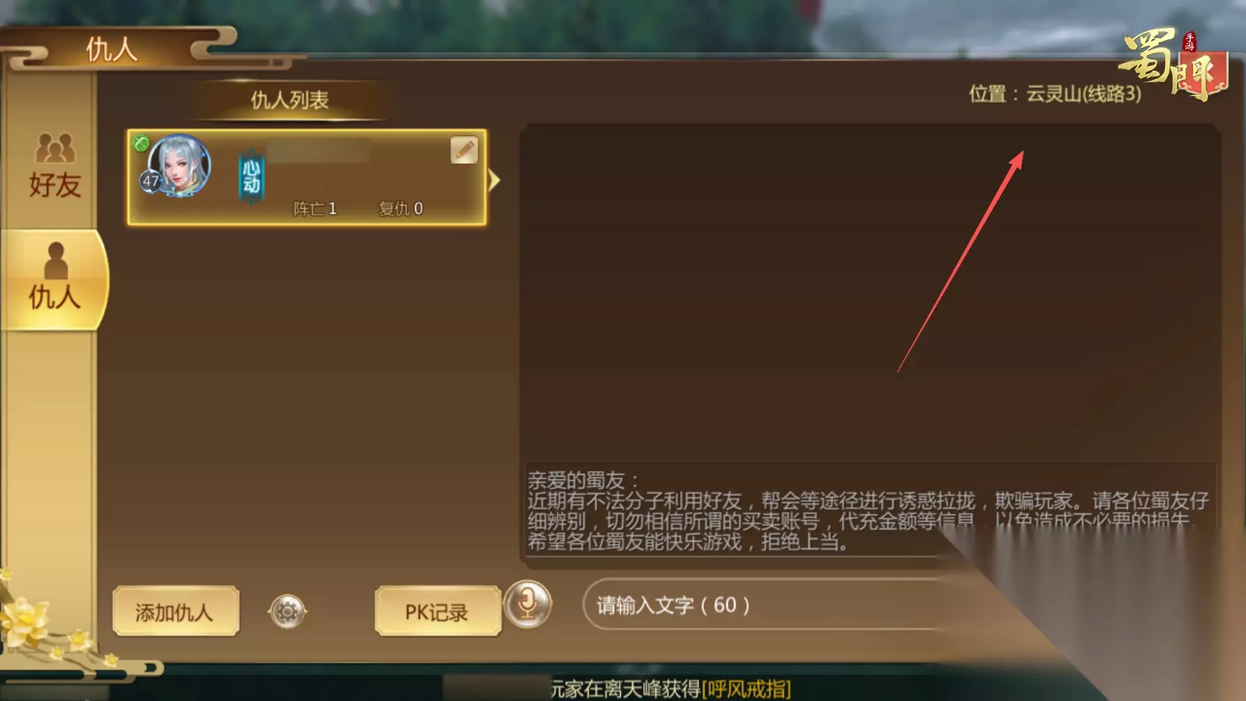 仇人界面优化!再也不怕被跑马灯挡视野 经常关注仇人列表的蜀友们表示,仇人位置显示很容易被跑马灯公告挡住,想看地图位置还要等上一会儿 ➤策划举手:改了改了!这次更新后,仇人位置信息直接挪到界面右上方,彻底避开公告遮挡区!以后打开仇人列表,遇到跑马灯后再也不用等公告消失才能看到位置信息啦!