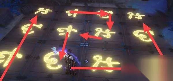 2:第一次解谜完之后,阵法会发生改变,这个时候还需要解谜一次,按照下图的路线再次进行解谜就可以了,按照上面的箭头依次走,走完之后就能到npc哪里领取宝箱了。