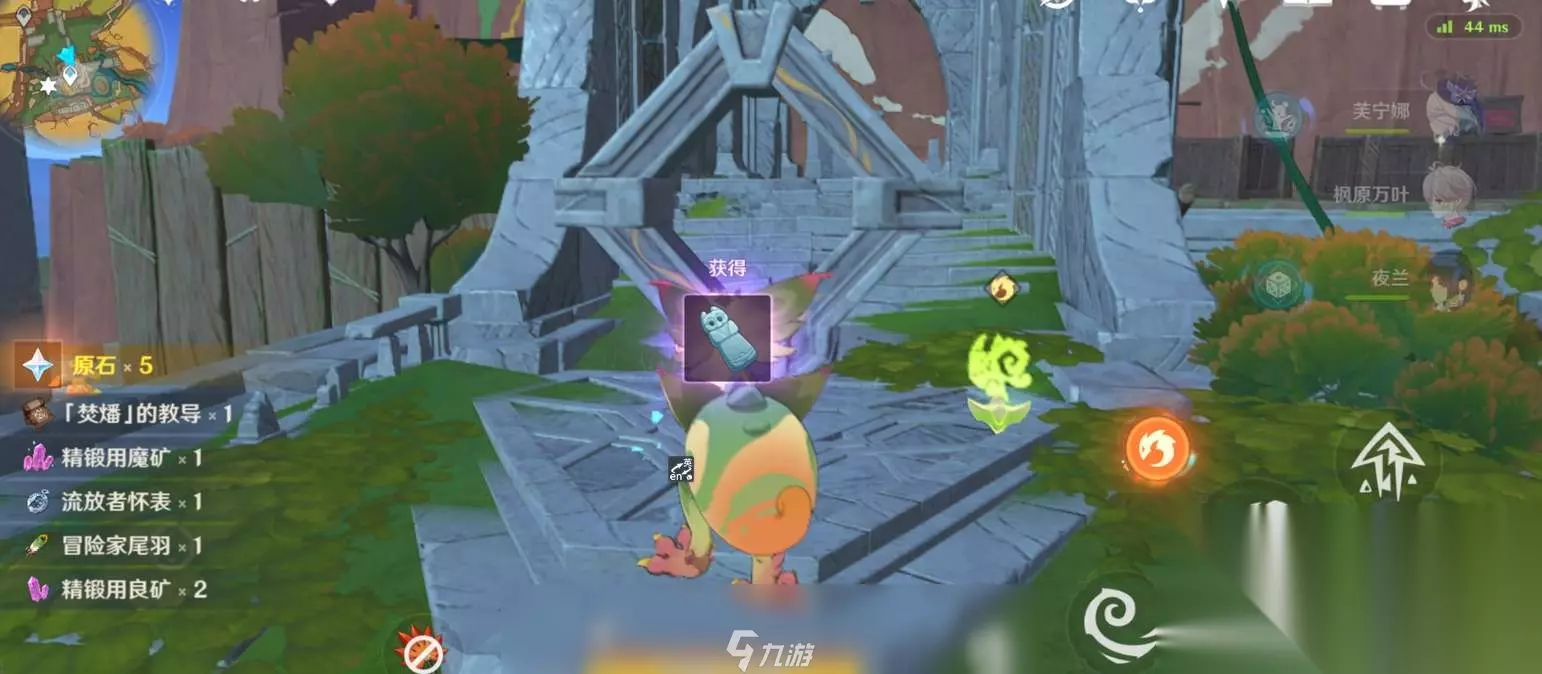 2、第二个钥匙 回到传送点,朝地图西北方向飞下会看到黑曜石。互动可进入夜魂试炼「达成成就:战场的召唤」。 然后来到中央传送点后方,地图北方向,将传接球打入接收器,解开机关,打开宝箱试炼钥匙。