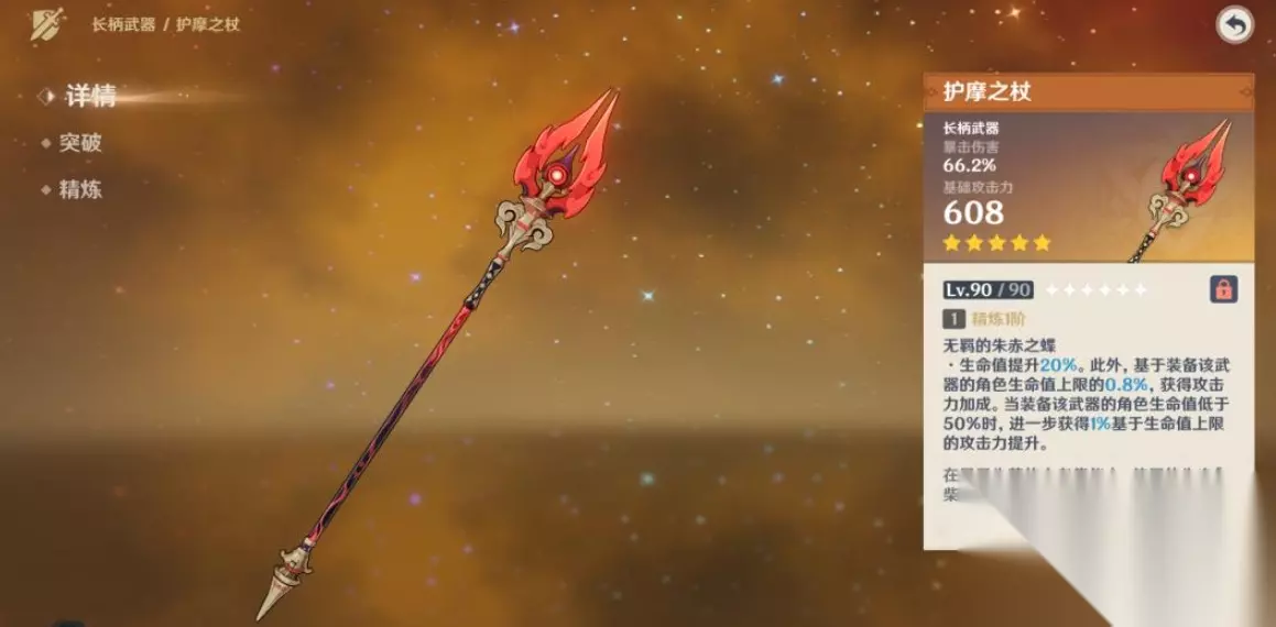 在原神这款充满奇幻与冒险的游戏中,有一把武器被誉为法系输出的瑰宝,它就是护摩之杖。今天,我们就来全面揭秘护摩之杖的满级属性以及获取与升级的详细攻略,让你轻松驾驭这把强大的武器,成为游戏中的佼佼者! 一、护摩之杖满级属性揭秘 护摩之杖,作为五星限定长柄武器,其满级属性令人瞩目。当等级达到90级时,它的基础攻击力将增加至608点,暴击伤害提升66.2%。此外,武器技能效果更为强大:生命值提升20%,并且基于装备该武器的角色生命值上限的0.8%,获得额外的攻击力加成。当角色生命值低于50%时,还能进一步获得1%基于生命值上限的攻击力提升。这样的属性加成,无疑让护摩之杖成为提升角色输出能力的绝佳选择。 二、护摩之杖获取攻略 想要获得这把强大的武器,并非易事。护摩之杖只能通过游戏中的祈愿系统获取,且为限定武器,不会进入常驻祈愿池。当然,祈愿需要消耗原石或祈愿币,所以玩家在平时的游戏中也要注意积累资源,以备不时之需。 三、护摩之杖升级攻略 获得护摩之杖后,如何将其升级至满级,发挥最大威力呢?以下是一些实用的升级攻略: 1. 收集升级材料:护摩之杖升级所需的材料包括紫色瓶装精华、抗争和勇气三种属性的神瞳,以及大量的蓝色、紫色和金色经验书。这些材料可以通过完成游戏中的任务、活动或探索世界获得。玩家需要注意资源的合理分配和使用,避免浪费。 2. 提升武器等级:在收集到足够的升级材料后,玩家可以前往铁匠铺或武器精炼界面,使用瓶装经验书提升护摩之杖的等级。等级提升后,武器的基础攻击力和属性加成也会相应增加。 3. 精炼武器:除了提升等级外,玩家还可以通过精炼护摩之杖来提高其属性加成和技能效果。精炼需要消耗相同的武器作为材料,因此玩家需要多留意游戏中的祈愿活动,以便获取更多的护摩之杖用于精炼。 四、护摩之杖最佳搭配角色 护摩之杖的属性主要与火元素相关,因此它非常适合搭配火元素角色使用。以下是一些与护摩之杖相得益彰的角色: - 迪卢克:作为火元素输出角色,迪卢克的技能和元素属性与护摩之杖完美契合。护摩之杖的高攻击力加成和元素充能效率可以大大提升迪卢克的输出能力。 - 香菱:香菱同样是一名火元素角色,她的技能和元素爆发能力也与护摩之杖相匹配。护摩之杖可以增强香菱的技能效果,提高其元素充能效率,使她在战斗中更加灵活多变。 - 班尼特:虽然班尼特的技能和元素属性与护摩之杖不完全匹配,但他作为一名治疗型角色,仍然可以利用护摩之杖提高元素充能效率,从而更加快速地进行治疗。 五、总结 护摩之杖作为原神中的一把强大武器,其满级属性和搭配角色都让人眼前一亮。想要获得并升级这把武器,需要玩家付出一定的努力和耐心。但相信只要你掌握了上述攻略,就一定能够轻松驾驭护摩之杖,成为游戏中的佼佼者!快来试试吧!