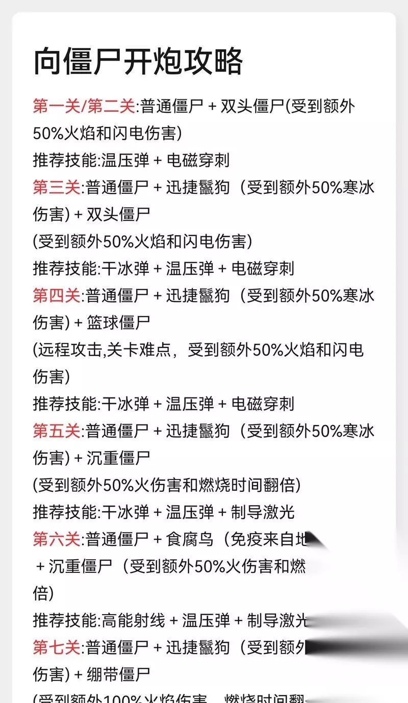 高效战斗技巧 在逆战僵尸模式中,掌握一些高效战斗技巧可以大大提高生存机会和战斗效率。 技巧一:有效利用武器和道具 武器升级:学会使用武器升级系统,根据情况快速升级武器,提高武器的杀伤力和特殊能力。 道具组合:合理使用道具,例如医疗包、复活石等,可以在关键时刻挽回局势,保持队伍的完整性。 技巧二:控制节奏和位置 节奏把控:控制好自己的节奏,不要过度冒进,也不要过度保守。根据僵尸的攻势进行合理的攻击和撤退。 位置选择:在防守时,选取有利的位置进行战斗,例如高处或者有障碍物的地方,可以有效减少被僵尸围攻的几率。 技巧三:适应不同僵尸类型 识别类型:了解不同类型的僵尸特点,有的僵尸耐力强、有的速度快,有的则会释放特殊技能。 应对策略:针对不同类型的僵尸采取不同的应对策略,对于快速僵尸,应使用范围伤害武器进行集中打击;而对于耐力型僵尸,可以利用远程武器进行长时间消耗战。