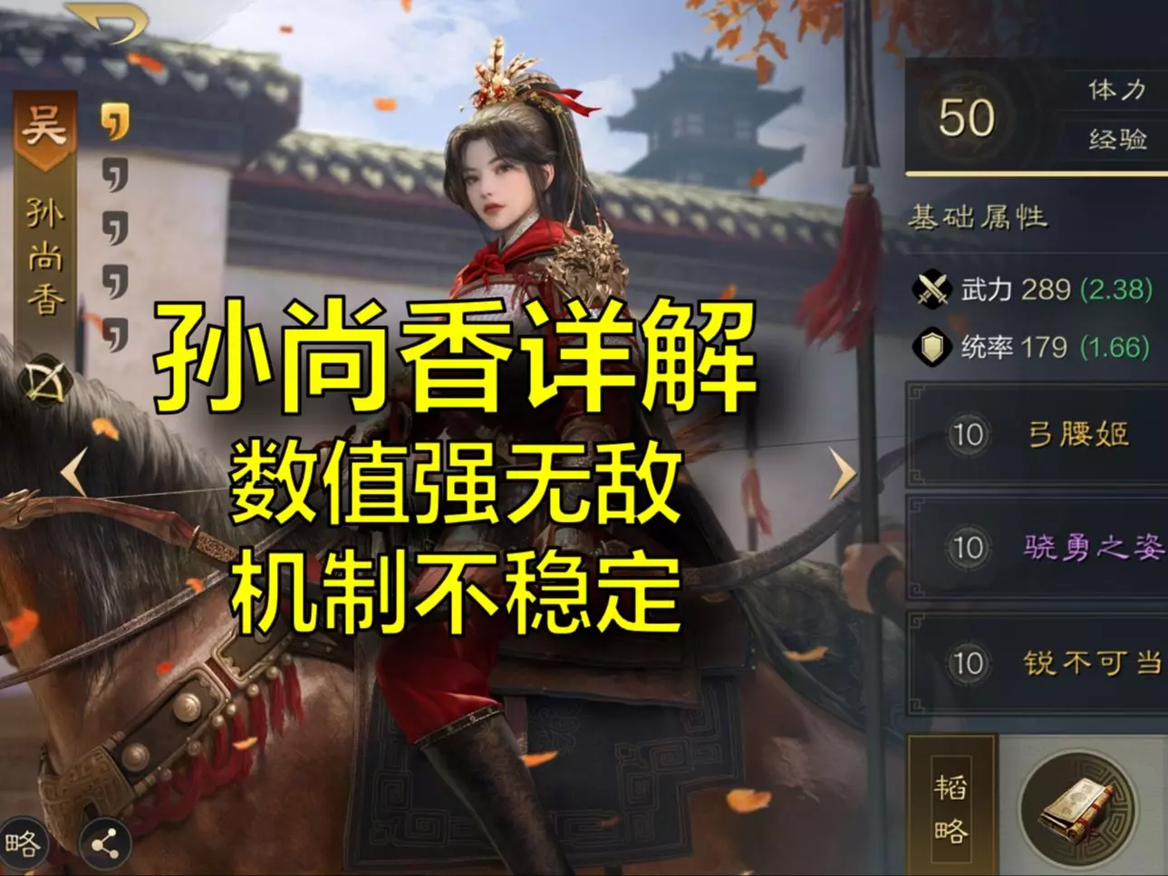 三国志战略版2026孙尚香角色介绍 【兵种适性】 骑兵:B 盾兵:B 弓兵:S 枪兵:A 器械:C 【武将生平】 孙坚之女。母亲是吴国太。孙策、孙权、孙翊、孙匡同父异母的妹妹。孙朗的亲妹妹。巾帼不让须眉。 演义: 209年,为拉拢刘备加入吴国阵营,奉命与刘备成亲。但是,孙尚香与母亲吴国太都很中意刘备。在刘备返回荆州时相随,并击退了企图擒拿刘备的吴将。213年, 在孙权谎报吴国太病危时,欲带刘禅返吴,但是刘禅却被赵云与张飞带回。后来得知刘备在夷陵阵亡,便投长江自尽了。 历史: 没有返回吴国后的记载。 【自带战法】 指挥战法 弓腰姬 发动概率:100% 发动普通攻击前对敌军单体造成兵刃伤害(伤害率62.5% → 125%),自身拥有功能性增益状态时提高9 → 18式力,最多叠加5次。