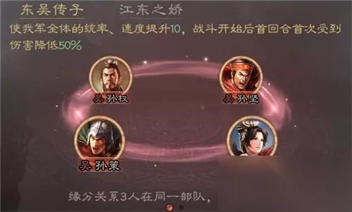 【羁绊】 东吴传子:孙坚+孙策+孙权+孙尚香 3人在同一部队时激活效果。 使我军全体的统率、速度提升10,战斗开始后首回合受到伤害降低50%。