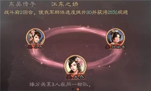 江东之娇:小乔+大乔+孙尚香 3人在同一部队时激活效果。 战斗前2回合,使我军群体速度提升30并获得25%规避。