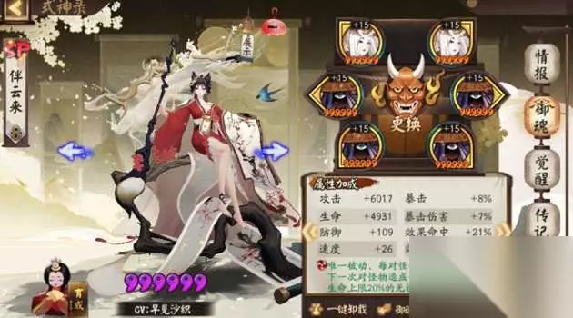 Ⅱ:绘世花鸟卷。 2021年8月诞生的SP化式神。 她的机制简单明了去形容的话,召唤物“画桩”就是高级版的“草人”,在针对血量巨厚的目标时,有着相当不错的放大“增伤”表现,所以在不少的PVE活动阵容都能看到她的身影。 御魂属性搭配推荐:速/攻攻攻、速/生生生、速生攻。 (生生生这类属于比较特殊一类) PVE方面: 破势:剩余的2两套一般会搭配荒骷髅or鬼灵歌伎一起,在打血量比较高的目标(例:超鬼王)会用到比较多。 心眼:跟破势一样,2件套也会选择荒骷髅or鬼灵歌伎一起搭配使用,心眼则是目标血量较低的时候效果最佳,通用的话也是可以一用的。 遗念火:也是搭配荒骷髅or鬼灵歌伎2件套一起,利用遗念火给佩戴式神减火的效果,多用于队伍用火紧张的情况。 狂骨:2件套搭配鬼灵歌伎居多,在逢魔「鬼灵歌伎」BOSS战应用,由于BOSS机制提供高额的攻击加成,所以御魂属性套为生生生。 PVP方面: (一般招财/遗念火居多,由于召唤物级别不高,基本上都是用于针对千姬的召唤物居多,缚姬的蛇灵优先级比她的高,会直接顶掉,所以斗技就业较少。)
