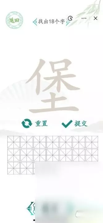 汉字找茬王找字堡怎么过 答案:堡、保、土、呆、仆、休、壬、仁、什、口、木、十、人、卜、干、三、二、一。 堡字释义: [ pù ] 用于地名。有的地区把“铺“”写作堡,如十里堡。 [ bǎo ] 用土石构筑的坚固小城或阵地。 北方人称村落为「堡」。 【组词】:张家堡 [ bǔ ] 堡子,有城墙的村镇。多用于地名,如吴堡(在陕西)、柴沟堡(在河北)。
