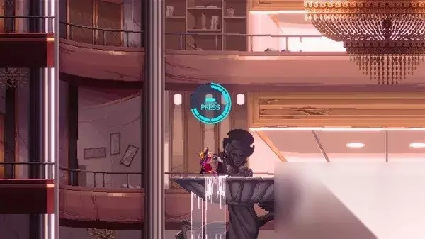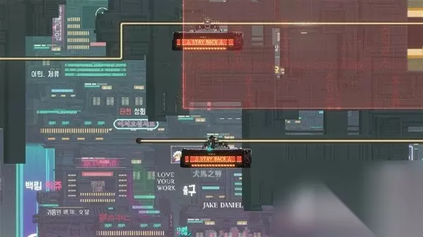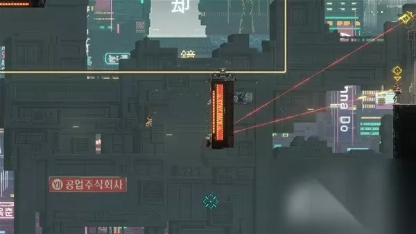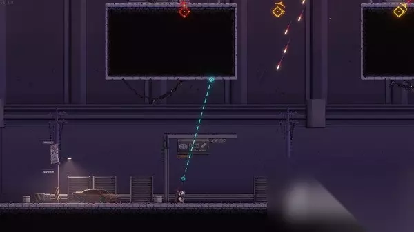 在此之前他的每一天都在对“山娜菲”的的追猎中度过,但这个神秘的存在神龙见首不见尾,直到有一天他似乎终于在一个名为“麻古市”的地方显露了踪迹,于是“准将”在前战友的帮助下空投到达赛博朋克风格的麻古市——此时的麻古市300万人口消失于无形,城市的控制者“麻古集团”成员被下达了自裁的命令,在这里迎接他的只有无处不在的杀人机器人、把城市变成废墟的钻头机器人、一个神秘的少女金玛丽和不知道身处何处的山娜菲,前路未仆的复仇之路也就此展开...... 2D横版蜘蛛侠?或许再加上一点武士刀零 作为一款平台跳跃游戏,《闪避刺客》首先吸引人的特色在于功能强大的勾爪系统:可以快速勾上部分墙壁,完成摆荡、冲刺摆荡(可以完成折角的向上冲刺)、快速拉放绳、翻转换边等操作。