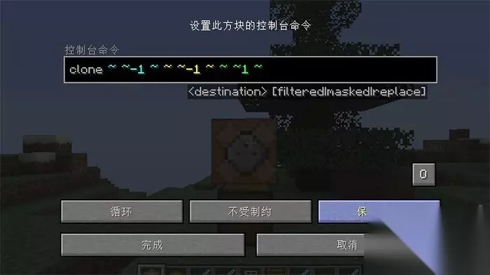 3、潜行(shift键)在箱子上面放一个命令方块,输入指令【clone ~ ~-1 ~ ~ ~-1 ~ ~ ~1 ~】,使用【循环】【不受制约】【保持开启】模式。 (上述指令是将方块下方箱子复制到上方,也可以不用这样堆叠,调整坐标即可,具体可参考clone指令格式)