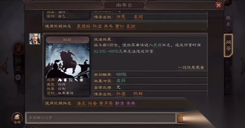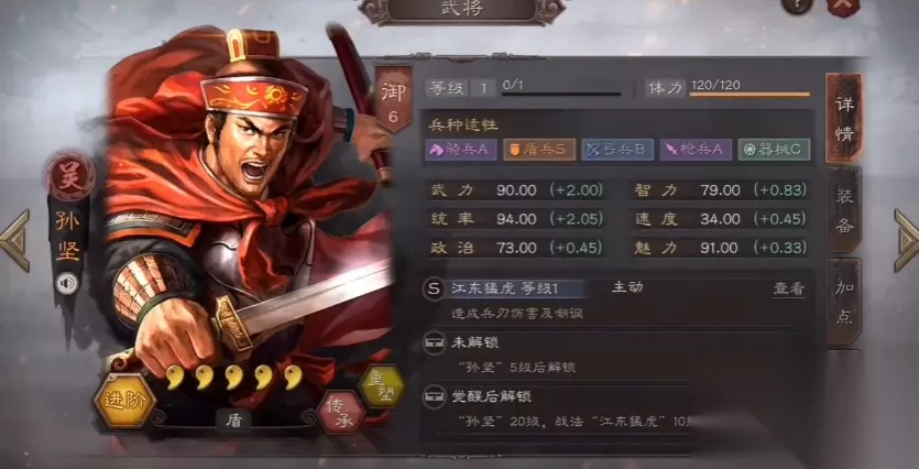 孙坚的统率成长高达2.05,加点应当以统率为主提升承伤能力。兵种适应性方面,盾兵S级适性是其最佳选择,枪兵与骑兵A级适性可作为备选方案。在野队编组时,建议将孙坚置于前锋位置吸收伤害,搭配具有治疗或增益效果的辅助武将。战法等级提升至满级十分必要,十级战法相比一级会产生质的飞跃,特别是对依赖发动率的嘲讽与控制类战法而言。 装备选择上优先考虑提升统率与防御特性的道具,八宝夜明铠等防具能有效增强生存能力。孙坚战法组合的核心逻辑在于平衡防御与输出。理想状态是通过嘲讽吸引火力,配合反击与控制形成持续压制,为队友创造输出空间。