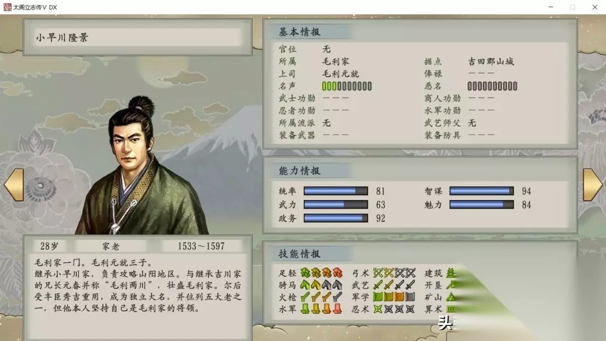 2,小早川隆景。用他当手下赚钱快,征兵多,打仗效率高。他和真田昌幸是必须拉拢的二人组。喝茶就能招募。