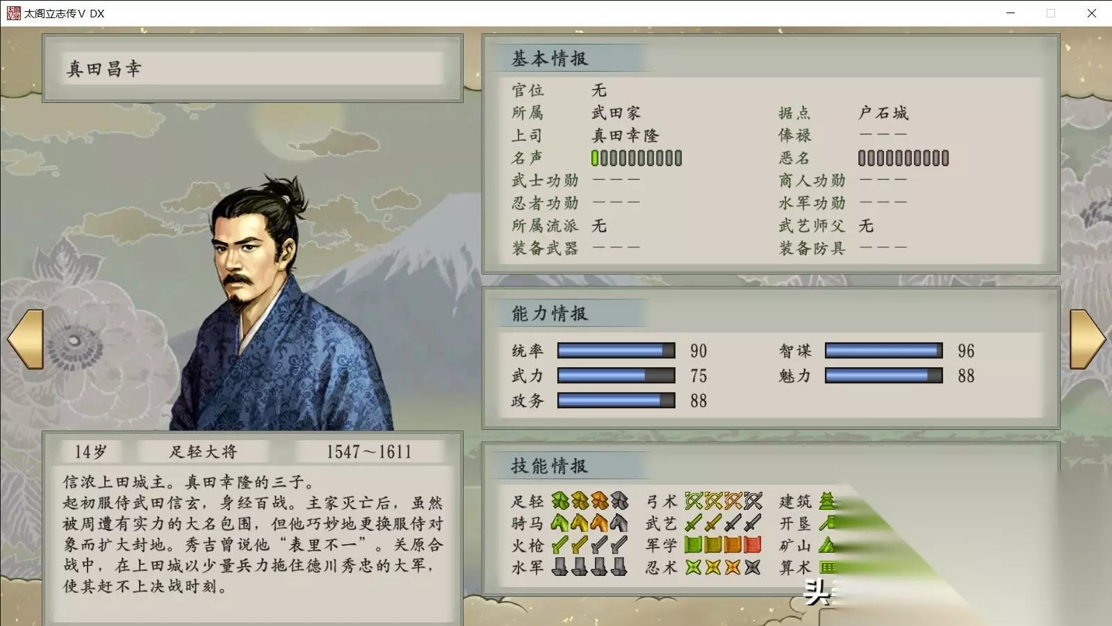 1,真田昌幸。他是玩家学习“凤林火山”的最佳人选。真田昌幸就是个墙头草,小虾米职业武士、商人和忍者的时候,都把他成功招募过。只有海贼没有成功。如果时间够长,他还会附赠他的儿子真田幸村成为玩家的手下,这两人绝对是最强的辅助。真田昌幸喝茶就能招募。