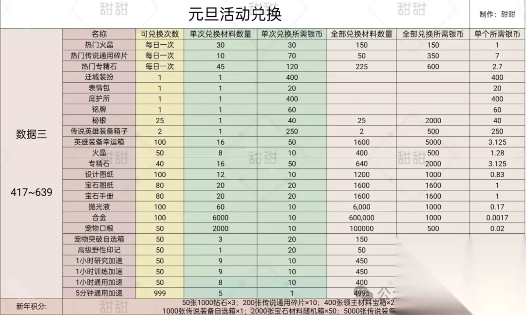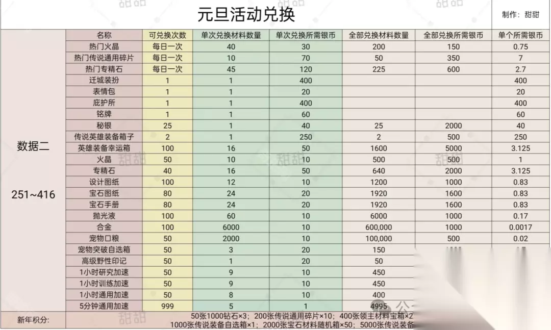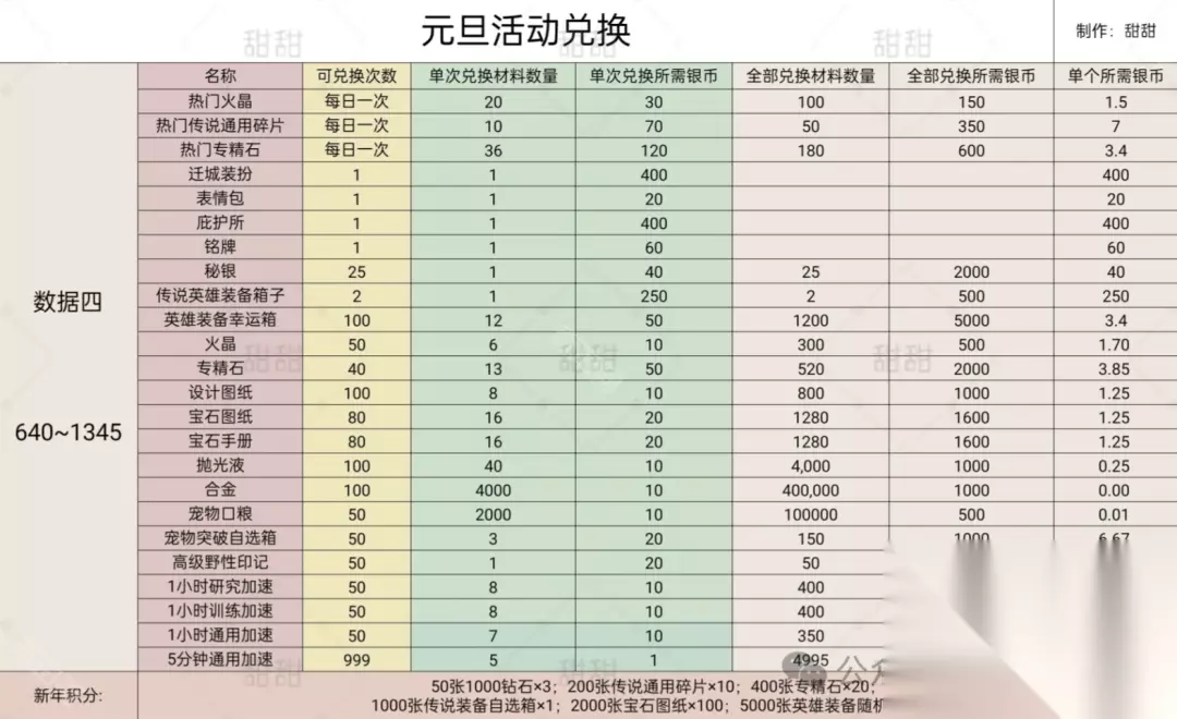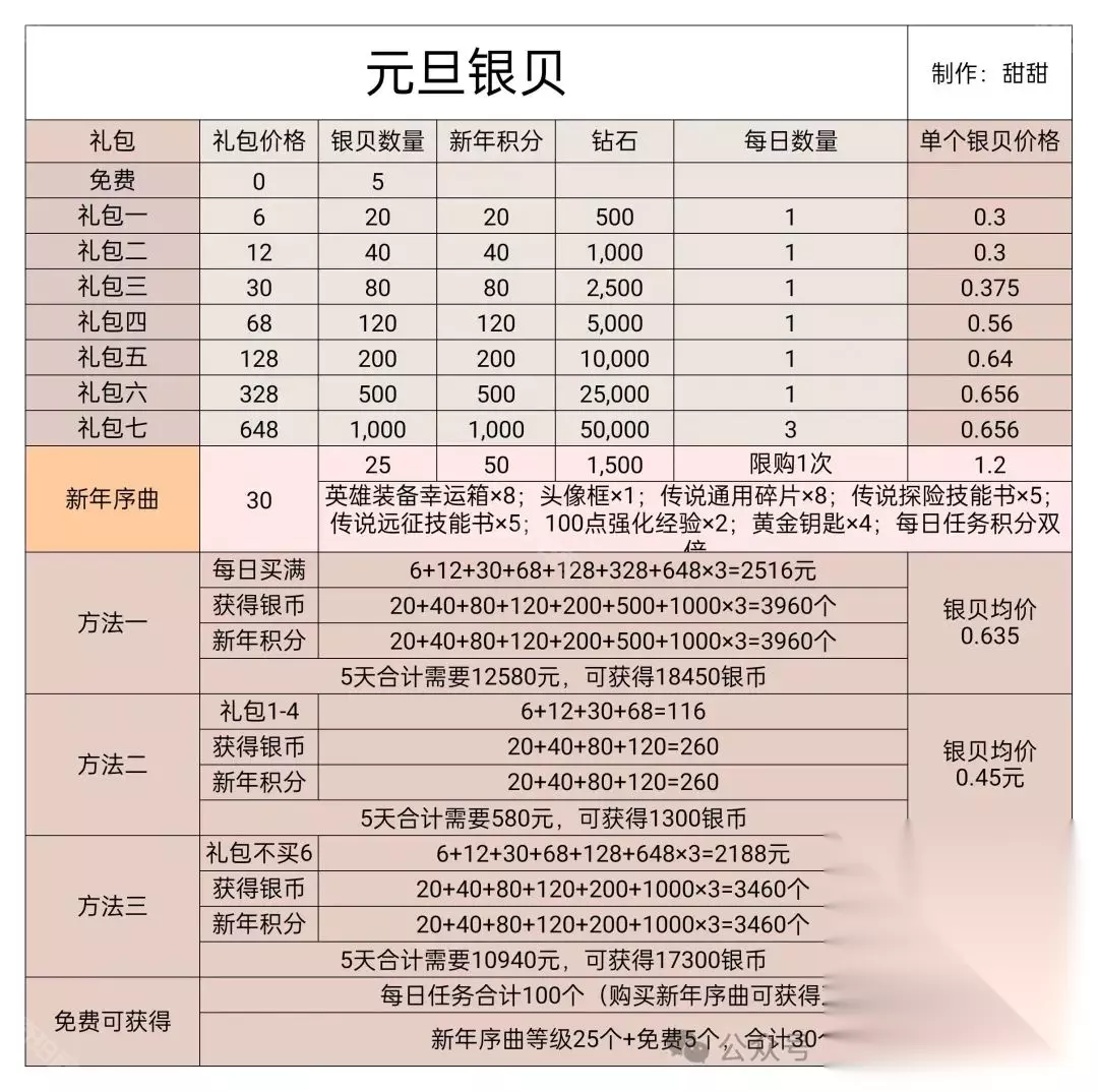 礼包价格如上图,每天可以买5次;且新年序曲可以总共获得150个新年积分 购买方法一:每日买满的价格为:2516;5天合计需要12580;共获得18450银币; 购买方法二:购买礼包1-4每日总共花费116;5天合计需要580;共获得1300银币; 购买方法三:购买礼包不买6每日总共花费2188;5天合计需要10940;共获得17300银币 三、元旦活动攻略总结 特效 ①只购买迁城特效:需要花费30r先购买序曲获得40银币*5=200银币,然后获得免费的序曲25个+免费礼包5个;共计获得230银币;需要购买5天6r礼包和2天12r的礼包;共获得410银币 总共花费30+30+24=84r ②完成400新年积分:新年序曲可以总共获得150个新年积分花费30r,需要5天都把6r的礼包都购买完,再补4天12r礼包,可以获得410新年积分; 总共花费108r ③完成5000新年积分:需要5天都把6-128的礼包都购买完,再补3个648礼包,可以获得5450新年积分 总共花费3164r 4、购买礼包的话不要先购买328那一档的 兑换 1、首先要对比自己区服的礼包单价(用上图去计算),热门是划算的,可以每日拿 2、640区之后兑换专精石优先,专精石的单价性价比可以; 3、优先缺啥补啥 氪佬可以优先换秘银>随机幸运箱>火晶>专精石>图纸 微氪0氪可以优先换火晶>秘银>专精石>图纸 4、注意一点,银贝可以留着下一次继续使用