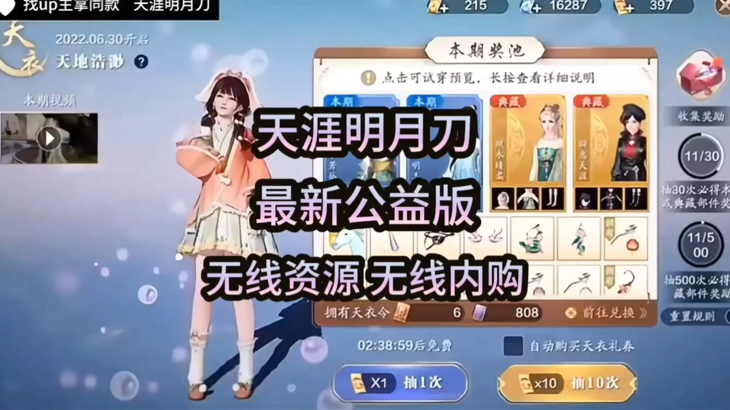 这是《天涯明月刀》的公益号分享内容,该公益号拥有无限资源,可进行落地无限连抽,能抽取到天衣令、丰彩染料、外观道具等多种游戏奖励,还展示了连抽获得奖励的界面。