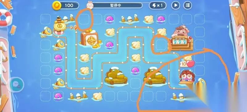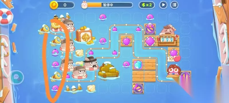 保卫萝卜4阿波尼克号攻略 这关随机性很大,如果一次过不了大家可以照着攻略多打几次。 步骤一 开局点暂停,将水雷安在如图位置,画圈处不要安水雷!