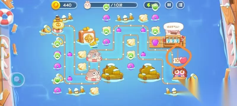 步骤二 等怪物与抽奖机刷新,第一个炮塔必定随机到图中圈出的这个位置,有可能是火箭弓弩,不一定是图片这个。