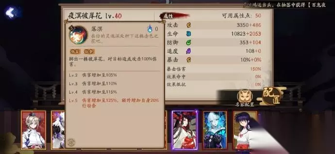 我们首先看一下SP彼岸花的属性面板。攻击S,生命B,防御C,速度A,暴击S。攻击和暴击的双S奠定了夜溟彼岸花作为输出式神的基础。满级后3350的攻击很标准,108的速度也是够用,另外暴击也不错,至于生命和防御,在PVE中的SP式神里面也算高的了。