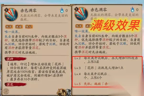 SP彼岸花的一技能和三技能并不是很出众,可是二技能就不一样了。看看二技能的溟种就明白了。溟种:【通用,印记】增加主动技能「花烬」;回合结束时,每有1层溟种受到夜溟彼岸花攻击100%伤害;若该伤害被免疫或被护盾完全吸收,则额外增加1层溟种;最多存在10个溟种。可以说这个溟种几乎就是外挂啊!直接让伤害翻几倍,这时候给夜溟彼岸花配上攻攻爆御魂,一旦叠上10个溟种,一下子就能把对方送走。