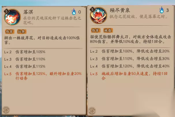 让我们再看一下SP彼岸花的技能。一技能落溟就不用说了,满级后就是攻击加拉条,二技能赤色凋零就有些SP式神的味道了,满级后可以让SP彼岸花获得先手,当SP彼岸花进入到休眠之后就厉害了,免伤免控免减益,这个效果一出还是挺香的。三技能殛尽黄泉满级后可以增加速度。分析到这小伙伴们也都看出来了,连普攻都能拉条,可以说SP彼岸花又是新的一个黑蛋大户了。