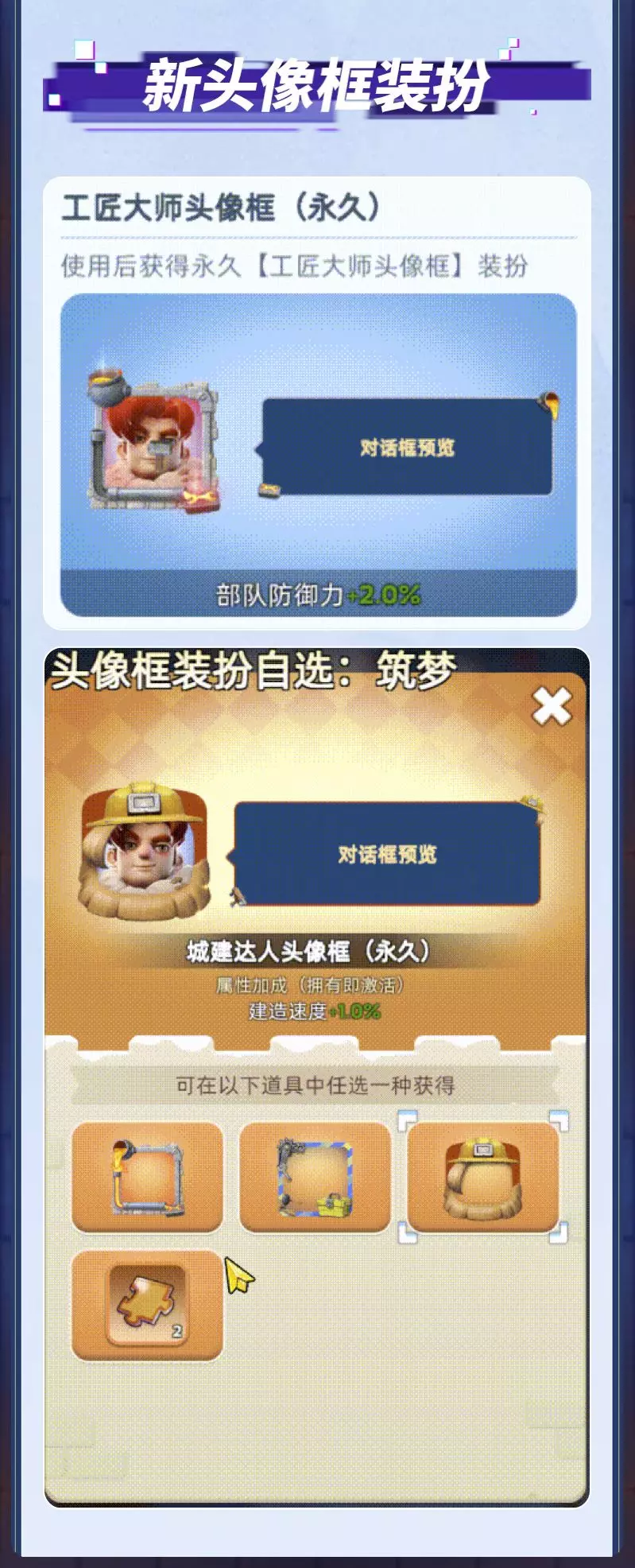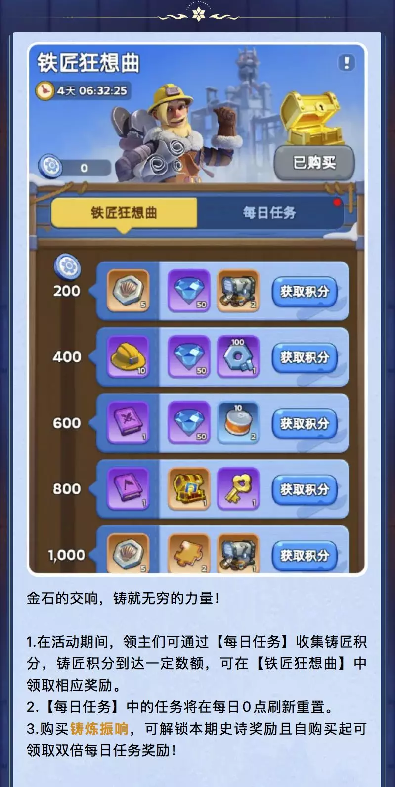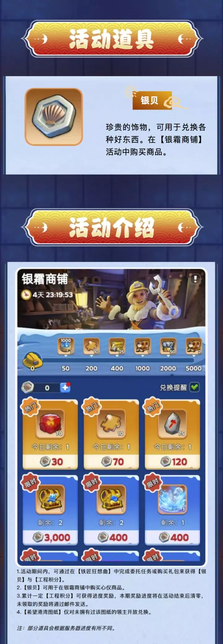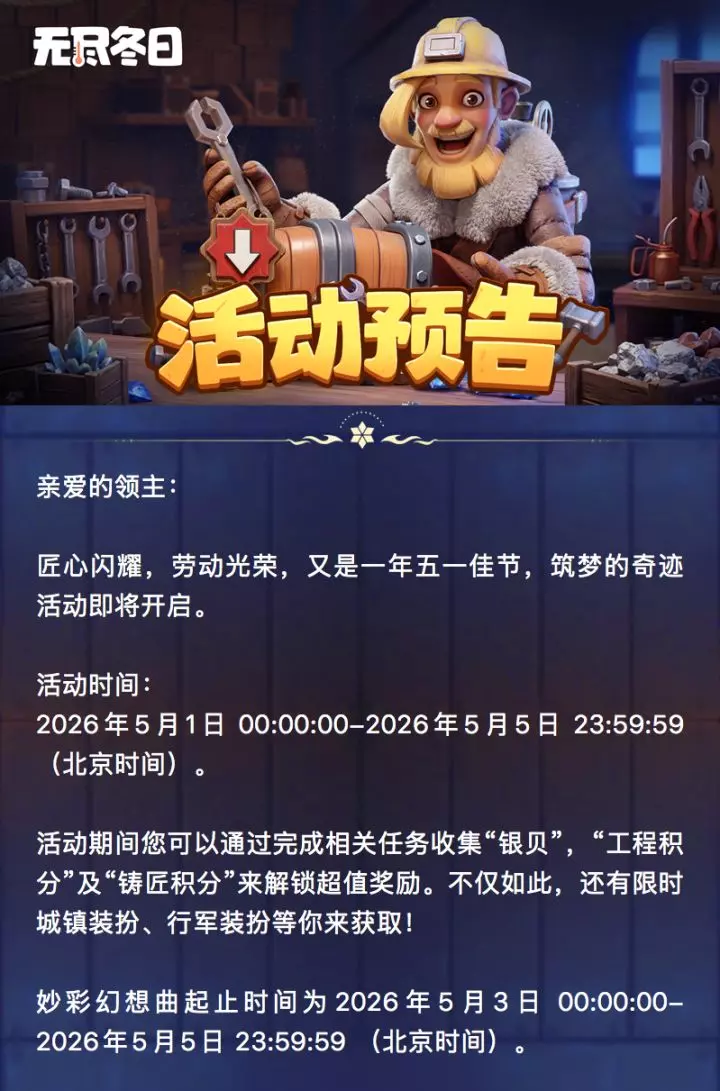 活动期间您可以通过完成相关任务收集“银贝”,“工程积分”及“铸匠积分”来解锁超值奖励。不仅如此,还有限时城镇装扮、行军装扮等你来获取!