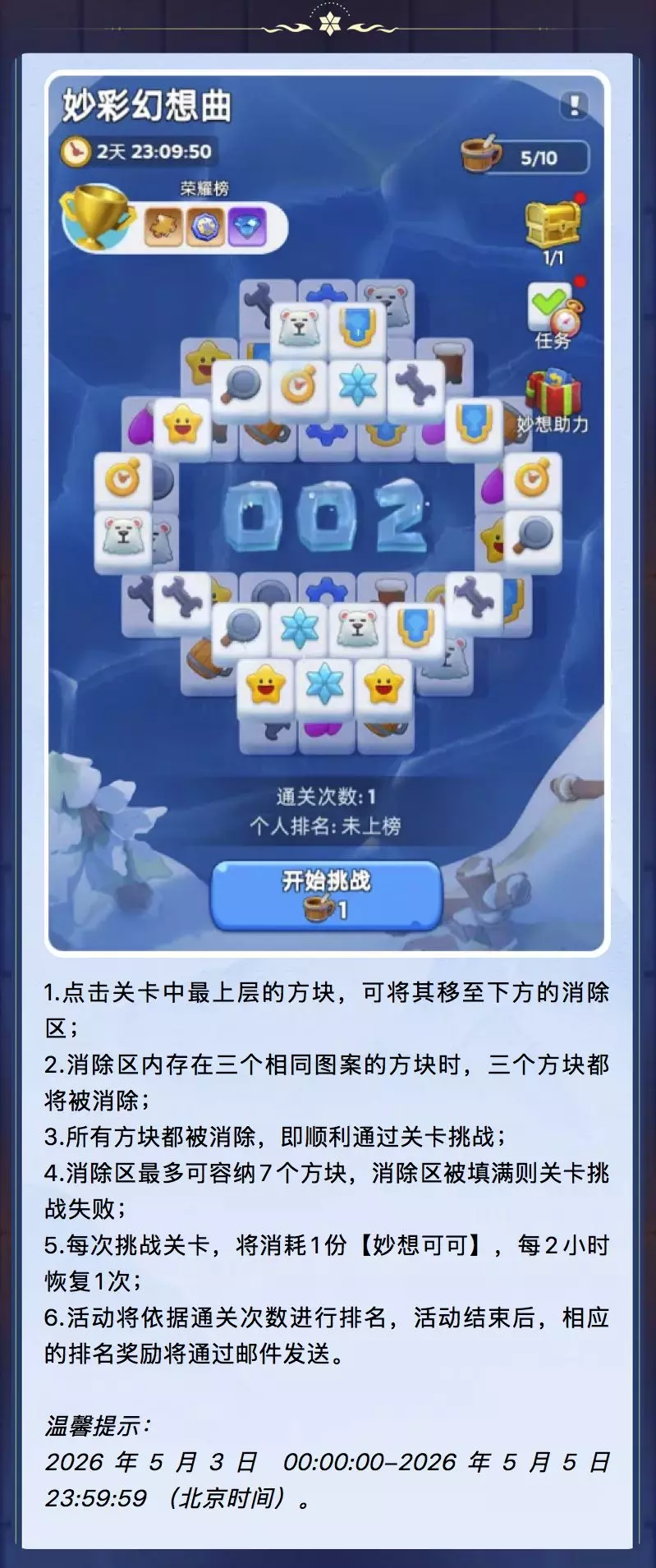 妙彩幻想曲起止时间为2026年5月3日 00:00:00-2026年5月5日 23:59:59 (北京时间)。