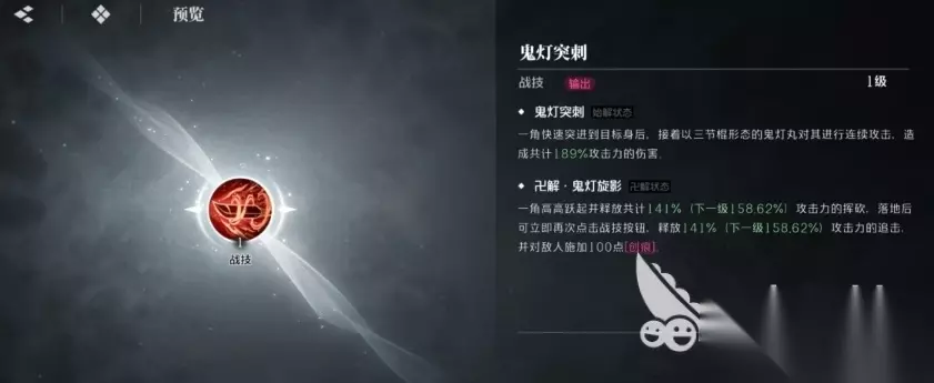 说到他的战技鬼灯突刺,更是将速度与力量完美结合,使用的时候斑目一角会如闪电般快速突进到目标身后,紧接着展开连续不断的攻击,而当开启万解之后,他更是会高高跃起,然后进行挥砍,落地之后,若玩家再次点击战技按钮,他还能释放一次强力的追击,并再次对敌人施加创痕,这里需要注意的是,每层创痕都能使敌人受到额外的伤害,且持续时间长达10秒钟,更令人惊叹的是这一效果可叠加至20层,一旦叠加起来,那造成的总伤害将是相当可观的。