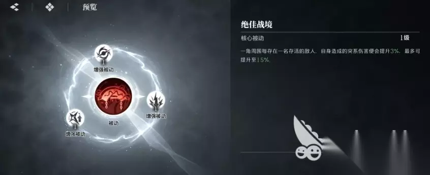 大家可以先来看斑目一角的核心被动绝佳战境,这一被动就是每当周围存在一名存活的敌人时就会触发,此时自身所造成的突袭伤害便会稳步提高3%,且最多能够提升至15%,这意味着随着战斗的推进,敌人数量逐渐减少但剩余敌人的生命值往往更为珍贵时,斑目一角的输出能力反而会不断增强,除此之外还有一些其他的增强型被动同样不容小觑,比如提升普攻分支伤害的效果,使得普攻分支在命中敌人时并非仅仅造成常规伤害,还能额外施加创痕效果。