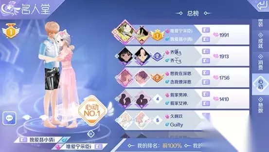 另外QQ炫舞手游中的名人堂,还有属于情侣的心动值排行榜,玩家可以看到当前大区的情侣心动值的名次。情侣间的心动值还是比较难获得的,记得每日去完成获得情侣之间的心动值任务。