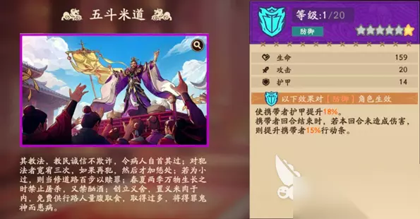 溯影主要给张鲁和糜夫人,张鲁可以选择五斗米道,当张鲁开启必杀模式时,身后角色的安全保障系数会不断提升。因此他的专属溯影就是五斗米,该溯影不仅可以使携带护甲提升18%携带者回合结束时,若本回合内未造成伤害,则提升携带者15%的行动条,获得护盾,提升自身的战场能力,可以让后方的主c安心输出。 携带者在进行治疗后可提升目标10%的攻击力,持续时间为一回合。