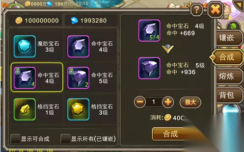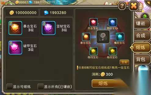 【合成规则】 1、使用4颗类型和等级相同的宝石,可以合成一颗同类型的高级宝石。 2、同类型宝石包括绑定和非绑。 3、成功合成后,宝石变成绑定状态。 4、合成宝石会消耗一定的金币,宝石等级越高,花费越多。 5、合成宝石100%成功。 三、熔炼