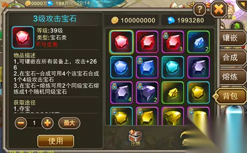 【背包规则】 1、所有渠道获得的宝石,都会显示在宝石背包界面上。 2、点击宝石,可在左侧查看相应的物品描述以及获取途径。 3、点击下方的 [ 出售 ] 按钮,可以把宝石出售给系统换取一定的金币。 4、点击下方的 [ 整理 ] 按钮,可使宝石背包按照同类从低级到高级的规则排序。 看完了各种宝石的获取方式,你是不是也已经跃跃待试了呢?赶快带着小伙伴到这片幻想大陆来试试手气吧!