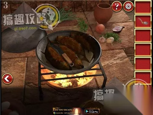 用勺子里的水把肉下面的火浇灭,并看到左边墙上的上下左右提示,用小刀把肉割开,活的里面的石头。