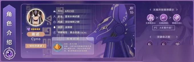 本篇文章由小编给您带来的原神赛诺值得玩家入手吗和赛诺复刻抽取建议分享的具体内容分享。在原神即将更新的3.5版本中即将迎来赛诺的复刻卡池,也是此次须弥版本的首个复刻角色,在游戏中的赛诺以长轴战场主C的定位为主,在激化绽放队中的伤害也是不错的,那么对于此次赛诺复刻值得玩家抽取吗?有什么抽取建议可以分享呢?想必大家对此都有疑问,下面就跟随小编一起来看看吧! 原神赛诺复刻抽取建议分享 1.原神赛诺值得抽的,赛诺强度十分在线,赛诺可以在目前的刻皇万柯队伍中替代刻晴的位置,打出不俗的伤害,对赛诺的充能有一定要求。 2.可以代替雷神进入雷九万班的队伍,对角色充能有很大要求,建议班尼特大招结束后赛诺若不能收尾则准备下一轮循环。 3.还可以把九条换为挂草工具人,非2命专武万叶换成白辰/讨龙砂糖。 4.也可以进入武装队,利用行秋北斗的抗打断体验割草快感,对角色配置要求较高。 5.也可直接带菲谢尔双雷充能带挂草工具人,补四千岩/磐岩钟离解决生存问题。 6.对于赛诺来说,作为新时代的超激化雷系站场输出角色,对队伍的要求较高。最大的问题是目前还没有强力草系角色搭配,培养柯莱/草主大多也只是过渡,后面出了小吉祥草王等强力挂草角色后,想提升赛诺队伍的输出需要把售后一起拿下,造价偏高。
