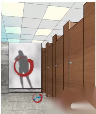 3、出来后的场景,先不急着找东西,先点最右边的隔间们,把里面的卷纸拖到女鬼在的隔间前面,然后点击人影、脚印、女鬼的脚,选择藏起来,即可通关。