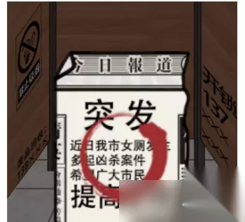 公厕恐惧是汉字找茬王中一个十分恐怖的挑战关卡,精心打造的恐怖氛围和背景音乐,令人烧脑的规则解谜,让不少玩家都被困在厕所之中,很多玩家无法通关,小编给大家带来汉字找茬王公厕恐惧通关攻略,一起来看看吧。 公厕恐惧通关攻略 1、汉字找茬王公厕恐惧第一个场景是厕所隔间内,点击新闻报道进入下一场景。
