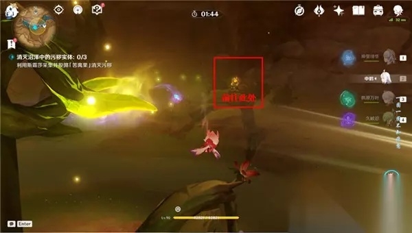 <4>完成后,我们需要消灭沼泽中的污秽物体,我们向右侧飞,会看到一颗光球,前往并收集(可以恢复斯露莎元素爆发能量),收集完后,我们驱散三个沼泽即可(利用斯露莎元素爆发)