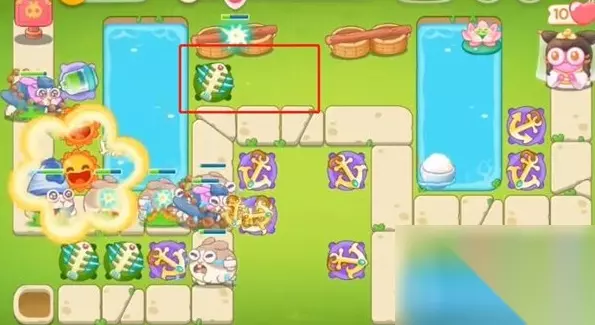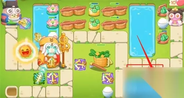 9、第九波左侧建立一个鱼骨头升一级打上面的障碍物,法海兔消灭,进入故事剧情,有金币之后升级满级,障碍物全清理。