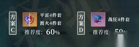 方案三:平雷四件套/渡火四件套; 方案四:战狂四件套。