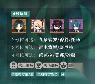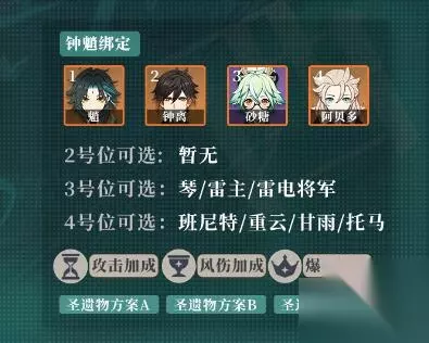 圣遗物词条 理之冠:暴击或暴伤 时之沙:攻击力,如果不凑双风也不用充能武器,那么选充能效率也不是不行 空之杯:风元素伤害,如果时之沙选择充能则可以换为攻击力 圣遗物搭配 方案一:风2+角斗士2,侧重单兵伤害; 方案二:风4,牺牲少量输出,可以为其他脱手角色减抗;