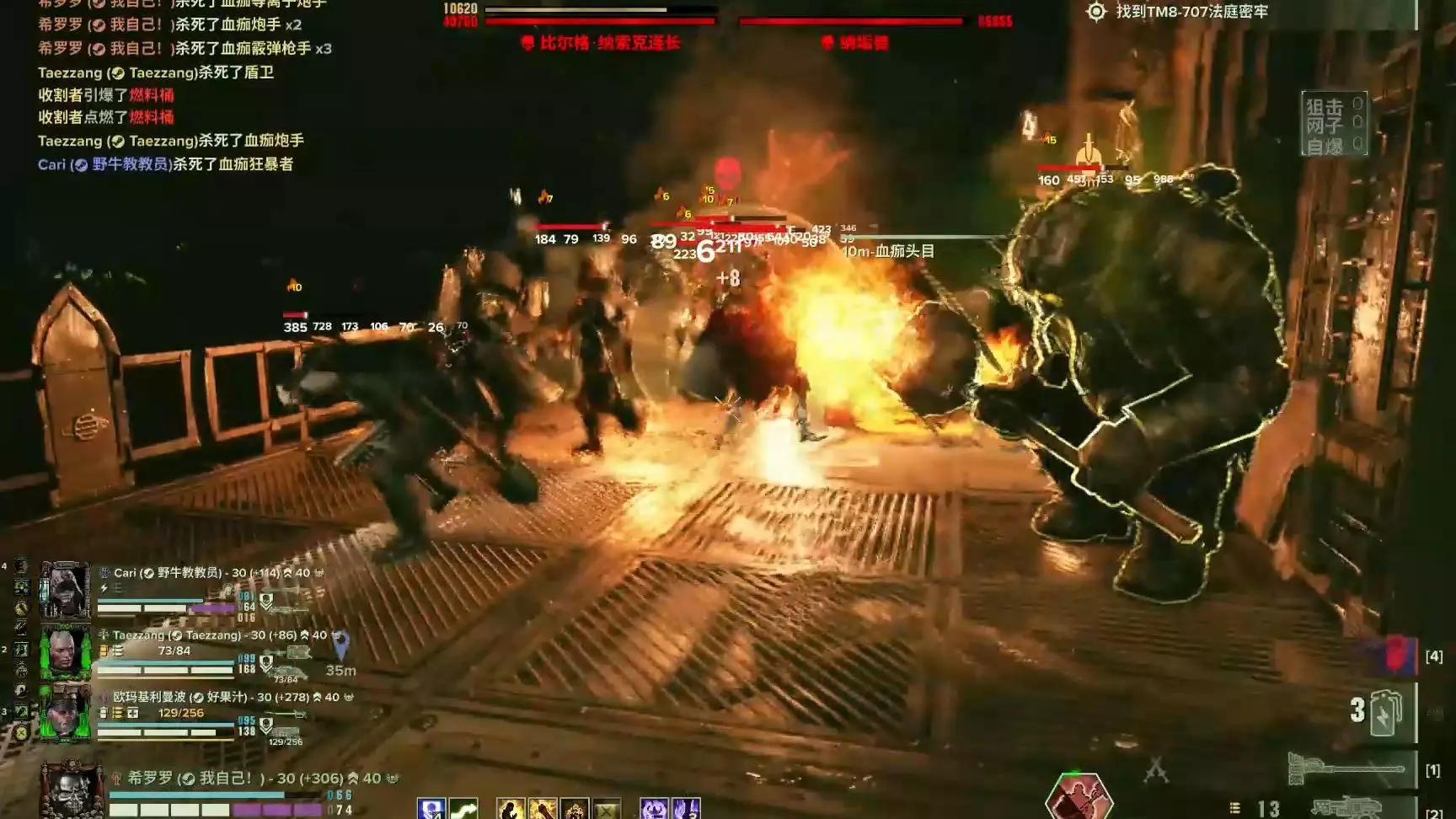 这是《战锤40K》的游戏内容,展示了玩家操控角色唐欧希灵在浩劫40模式中,和队友一同战斗,击杀瘟疫猎犬、血痂陷阱手等敌人,完成通过维修隧道等任务的游戏过程。