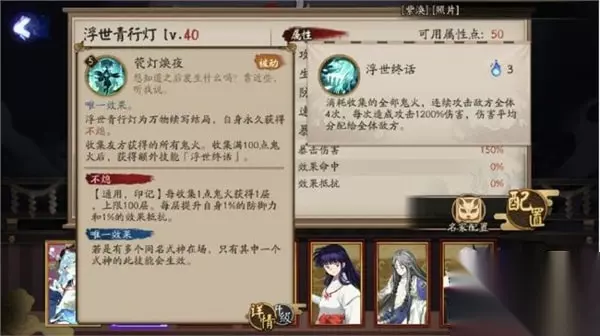 收集友方获得的所有鬼火。收集满 100 点鬼火后,获得额外技能「浮世终话」。 浮世终话 消耗收集的全部鬼火,连续攻击敌方全体 4 次,每次造成攻击1200%伤害,伤害平均分配给全体敌方。