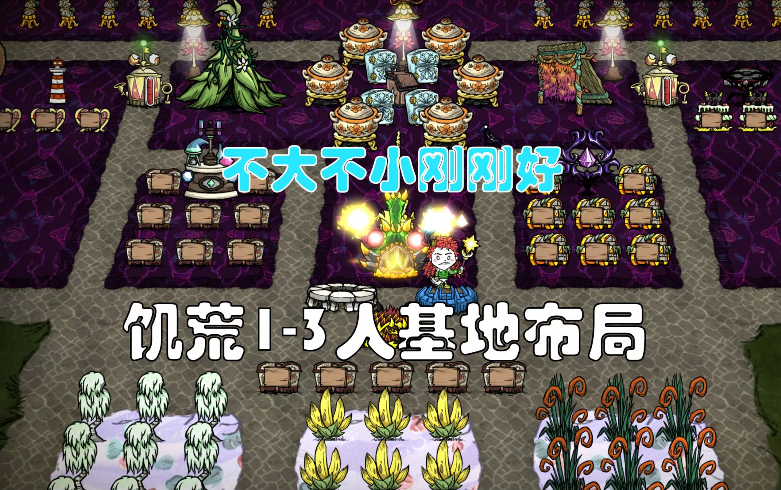 这是《饥荒》植物人100天开荒流程的第九期内容,展示了游戏里的基地布局,包含各类储物箱、烹饪锅等设施,还呈现了冬季里玩家整理物资、规划铺设地板、尝试获取见着护符等开荒操作。