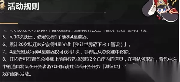 3:这里小编建议别让世界静下来四星光锥是必须领取的,不管你能不能用上必须领取这个光锥; 4:然后第二个的话,小编建议选择手套,手套固定攻击力,这里更推荐快枪手手套,因为快枪手两件套有攻击力的加成; 5:领取是有条件的我们必须完成开拓任务,湛蓝星中的宇宙安宁片刻任务才能来网页中领取的,不然的话是不能领取的。