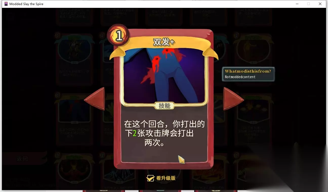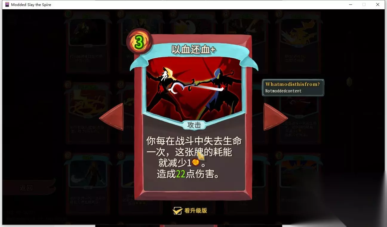 力量战的中后期核心,升级之后可以反复打出,只需要1能量,不会卡手尤其是在力量已经叠起来之后,缺点是比较难拿到 飞剑回旋镖