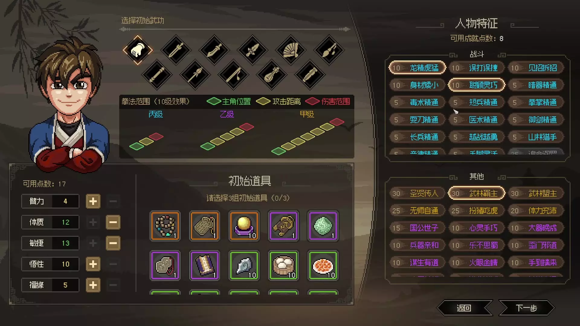 这是半瓶神仙醋开发的开放世界武侠RPG《大侠立志传》的新手加点攻略,推荐新手先将敏捷加满,副属性加体质,天赋推荐自愈体质和身如鬼魅,还可选择初始道具与武功,助力新手快速上手。