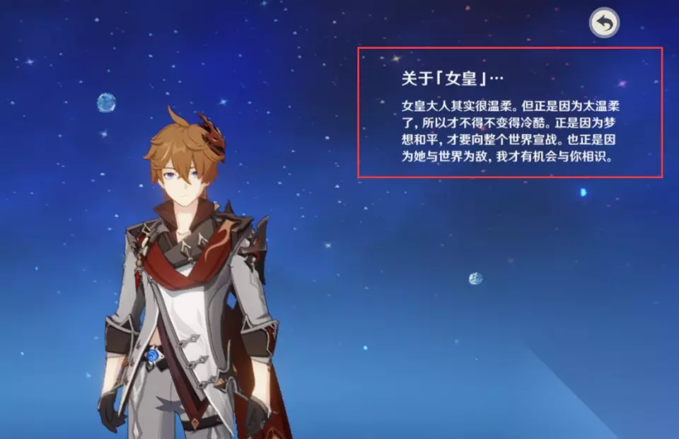 第一次,玩家应该是在李越魔神的故事里。为了达到自己的目的,他多次使用旅行者,最后释放了魔神。他还和那个带着魔王的旅行者打了一场战争。对于公子最真诚的评价,他还是喜欢他说的第一句话“我不是坏人,额,我大概是坏人吧,我不是来麻烦你的”,充满矛盾。但是公子就是这么矛盾。是旅行者的勇士,有好有坏。 公子-亲人 在《月亮的故事》中,公子的弟弟独眼小宝,托克,出现了。为了不让弟弟知道冬国的阴暗面和小宝在《铁甲,公子与旅行者》中的真实角色,他对弟弟托克,撒了谎,最终让弟弟相信哥哥是个好人,温柔的哥哥,是家里的顶梁柱。我弟弟托克也喜欢冒险。我们可以看到他儿子小时候的影子,但是14岁的正义已经变了,依然是深渊。只有深渊可能藏着比至冬国阴暗面更阴暗的东西能让一个14岁的男孩成为愚人众的执行官 公子-女皇
