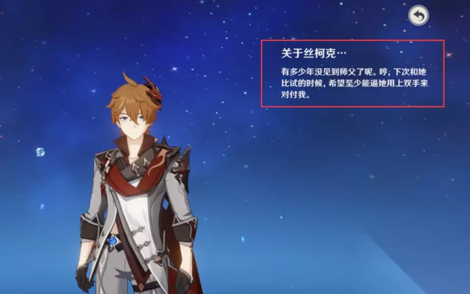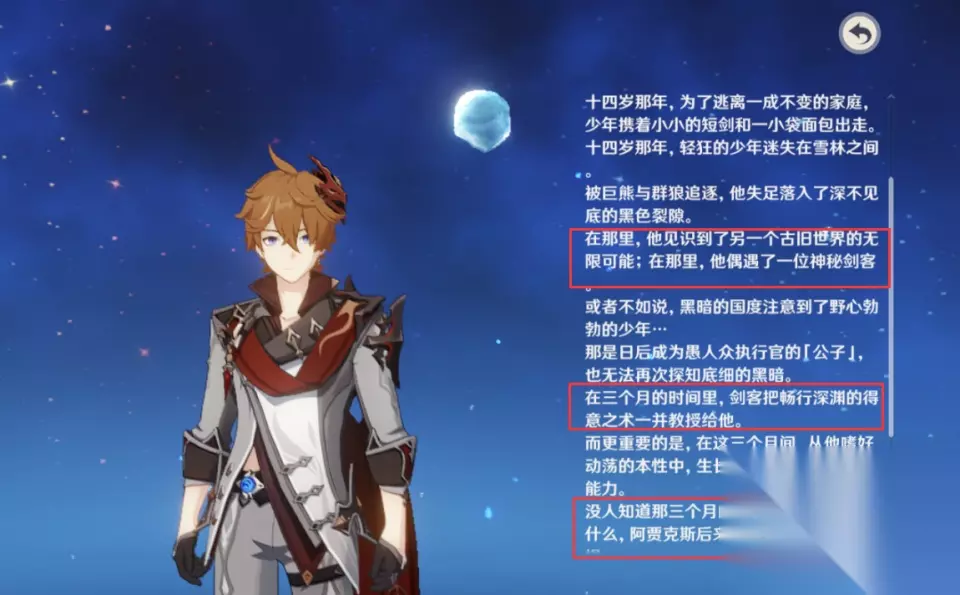 在深渊里,公子学到了常人一辈子都掌握不了的秘密,但也让公子变得咄咄逼人,改变了信仰(深渊里的经历没有人知道,但这三个月让公子看到了世界的残酷,他也意识到了只有变强才能保护自己至亲至爱的国家和家人),但在公子眼中的三个月,在现实世界里只过去了三天。当他妈妈找到他时,他已经不是以前那个小男孩了。 公子-旅行者