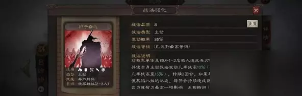 加点:全武力。 由上图狮子奋迅的战法说明可知,吕玲绮的自带战法狮子奋迅在对敌人造成伤害的同时可以使主动战法的发动概率提高,自身为主将时甚至可以提高主动战法15%的发动概率。但是狮子奋迅这个战法本身的发动概率较低,只有35%,因此我们让副将张任携带了兵种白马义从,将狮子奋迅的首回合发动概率提高10%,达到了45%的可观发动概率,同时让吕绮玲获得先手避免被控制。 那么,只要首回合吕玲绮成功发动战法狮子奋迅,那么她所携带的全战法发动概率提高15%,再加上白马义从的提高主动战法10%发动概率的效果,可以把原来35%发动概率的落凤提高到60%,把原来40%概率的轻勇飞燕提高到65%。甚至,第二回合时狮子奋迅的发动概率能提高到60%,可以很好的打出控制与爆发伤害。 2.朱儁 镇压黄巾+乘敌不虞+坐守孤城 乘敌不虞可用挫锐,挫志怒袭等战法替代; 坐守孤城可用整装待发,刮骨疗毒等治疗战法替代。 加点:全智力。 队伍中的三个人还是比较脆皮的,因此让朱儁携带了两个治疗战法。乘敌不虞可以对敌方主将造成虚弱,我方主将造成治疗,持续两回合。可以很好的限制大部分单核输出队伍,同时保证我方爆发点吕玲绮的兵量。坐守孤城较高的发动概率,治疗两人,可以增加队伍续航。朱儁自带战法镇压黄巾有着稳定的伤害,可以作为队伍伤害的补充。 3.张任 落凤+纵兵劫掠+白马义从 战法备选:不辱使命。 加点:全武力。 张任携带了落凤,纵兵劫掠,可以很好的限制对面的输出,同时为队伍补充伤害。 三、兵书解析 1.吕玲绮 胜而益强、胜战、执锐 吕玲绮的身板还是比较脆弱的,带胜而益强可以帮助少量回兵增加续航。胜战可以让吕玲绮在第二回合更好的爆发,执锐可以加强其伤害。 2.朱儁 后发先至 占卜 朱儁的速度偏慢,为了避免准备战法乘敌不虞的发动不被打断,因此,需要配置后发先至的兵书。占卜6%的减伤可以让朱儁站场更久。 3.张任 胜而益强,胜战 同样的,张任的身板也是比较脆弱的,带胜而益强可以帮助少量回兵增加续航。胜战可以让张任在第二回合打出更多的伤害。 综上,这只队伍拥有双落凤的计穷,纵兵劫掠的震慑,乘敌不虞的虚弱,可以很好的限制敌方输出。同时自身拥有不俗的爆发。性价比十分的高。 四、阵容特点 【优势】 1、朱儁、张任均为四星紫将容易获得。 2、应对主流队伍吴骑,蜀枪,三势陆均有一战之力。 3、将张任替换为公孙瓒后,可与主流队伍共存。 【劣势】 1、十分依赖吕玲绮的爆发,若吕玲绮被控制或哑火容易陷入被动 2、被桃园盾这种高回复的队伍克制 3、被司马盾这种用被动大伤害的队伍克制